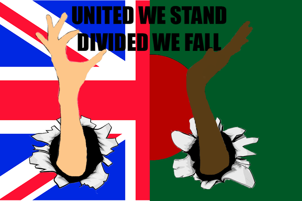 First of all I started off my postcard by designing the background. I wanted my background to be a visual representation of my nationality as a British Bangladeshi so I used both of the flags and combined it into one. I am a big fan of motivational quotes and I love keeping a log of quotes that inspire me. I felt as if the quote “United we stand, divided we fall” would be a suitable title for my postcard because I wanted this to be the theme of my project. This quote is also a positive reflection of Oldham (the town I grew up in). A decade ago racial tension was dangerously high and hate crimes were on the rise which led to people isolating themselves into their own areas, neighbourhoods used to feel like territories and people were constantly looking over their shoulders. However, we have moved on from the dark past and Oldham is now a safe, care free place to live in. Furthermore, I then had an idea to use two silhouettes of hands shaking each other after seeing some examples on google, but instead I used my own idea to personify my project by creating the effect that the hands were shooting through the flag to hold up the quote, one from the union flag and one from the Bangladesh flag as a sign of unity. The reason why I chose this topic is because this played a big part in my life and everyone that grew up in Greater Manchester in the past two decades.