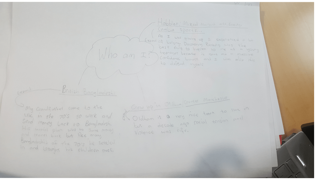I decided I was going to make three postcards which would give my reader a better understanding of my cultural background, my hobbies and what influenced me growing up. I started off writing a very brief mind map with a self centering question “Who am I?” Although the mind map was very brief and basic I had a lot of visual ideas flooding in which I began to sketch up.