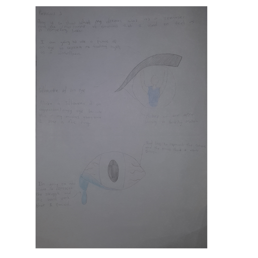 My third postcard was inspired by a tattoo of one of my favourite UFC fighters TJ Dillashaw. The tattoo is a picture of his wife’s eye and in the eye is a reflection of him after winning the world championship title. This reminded me about my dream as a young teenager when my only vision was to be a professional boxer, it also reminded me about the tough training camps that I was doing when I was preparing myself for upcoming matches. I want my postcard to be a resemblance of the hard work and torturous training that I put myself through to become successful.