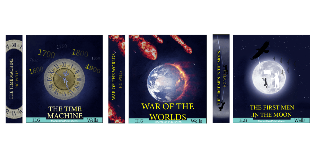 I began to sketch my ideas on to paper, the first book I began to design was ‘The time machine’. The second book was the ‘War of the worlds’ and the third one was ‘The first men in the moon’. This is what my ideas looked like on paper.