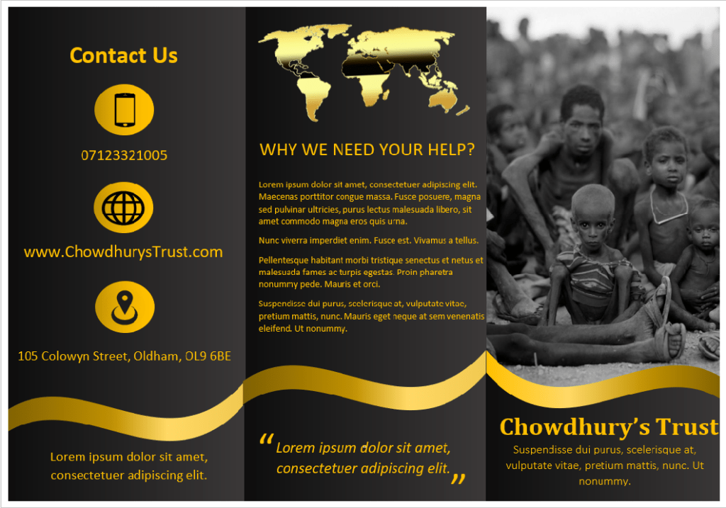 Overall I was very happy with how my leaflet looked. The way my black background colour blends from dark to light is something that I am very impressed with, also the juxtaposition of the golden designs and the colour of the fonts compliments my leaflet. I was a bit worried at first because I wasn’t sure if black and gold would be the correct colour scheme for a charity fundraising event aimed for children in Africa. However, once my design was completed I was very pleased with how it looked.