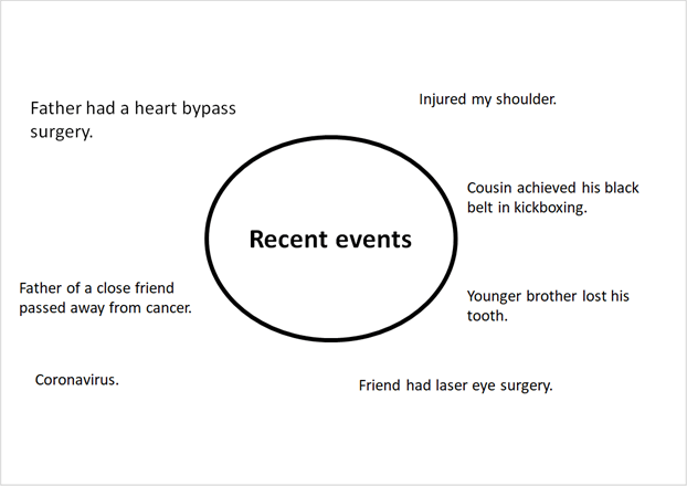 The three events that I am going to choose are: “losing your first tooth” “achieving your black belt” and “laser eye surgery”. I can construct an idea with any of the events on my mind-map but the three I picked are the ones that caught my attention the most.