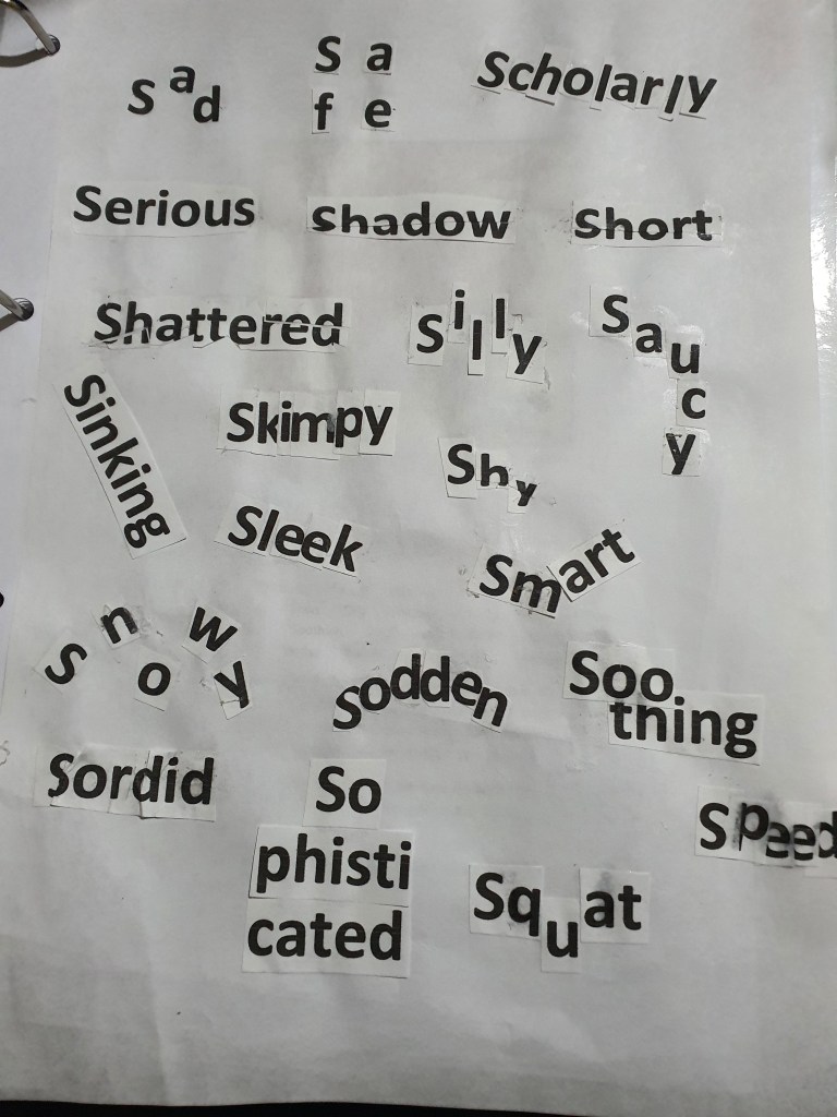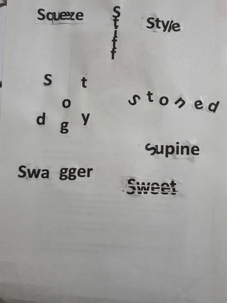 The designs I was most impressed with were the words: safe, squeeze, squat, shy, skimpy, stiff and saucy. For the word safe I put the letters in each corner and put a box around it, I was visualising a padlock when I was doing this, I also placed the word in the middle of the page because the middle is usually the safest place. I really enjoyed working with the words squeeze, squat and shy, the reason for this is because I was able to place the letters in a way that each position had a visual meaning, for example the placement of the letters in the word squat resembles a persons lower body squatting, for the word squeeze I squashed all of the letters together to emphasize the meaning of the word, for the word shy, I cut out the bottom half of the word where I put a line to make it look as if the word is hiding out of shyness. Even though the words skimpy, stiff and saucy didn’t require me to think outside of the box I was still very happy because the aesthetic design of the words resembled its meaning.