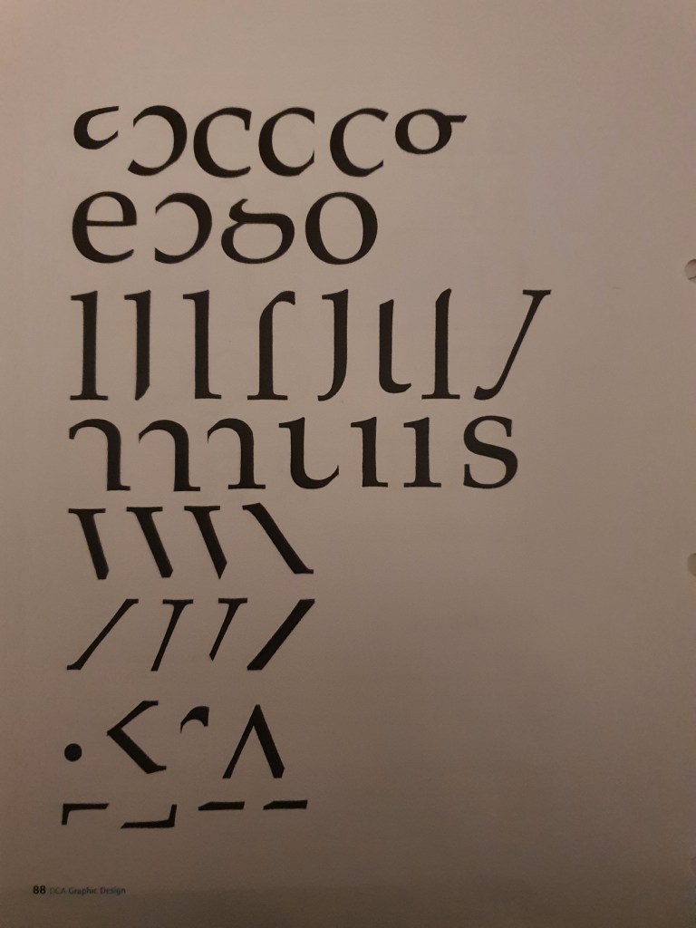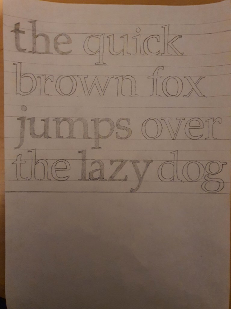 When I was younger I always had a keen interest in different types of fonts, I used to analyse different fonts on the internet which I then used to copy with pen and paper. This exercise felt like I was taking part in an old hobby of mine, only difference was that this task was more informative in teaching me the names of the specific details such as the strokes, serif and bowls. Overall I found this exercise enjoyable, brushing up on old skills was great fun and learning about the actual names of the ‘strokes, serifs and bowls’ was very informative.