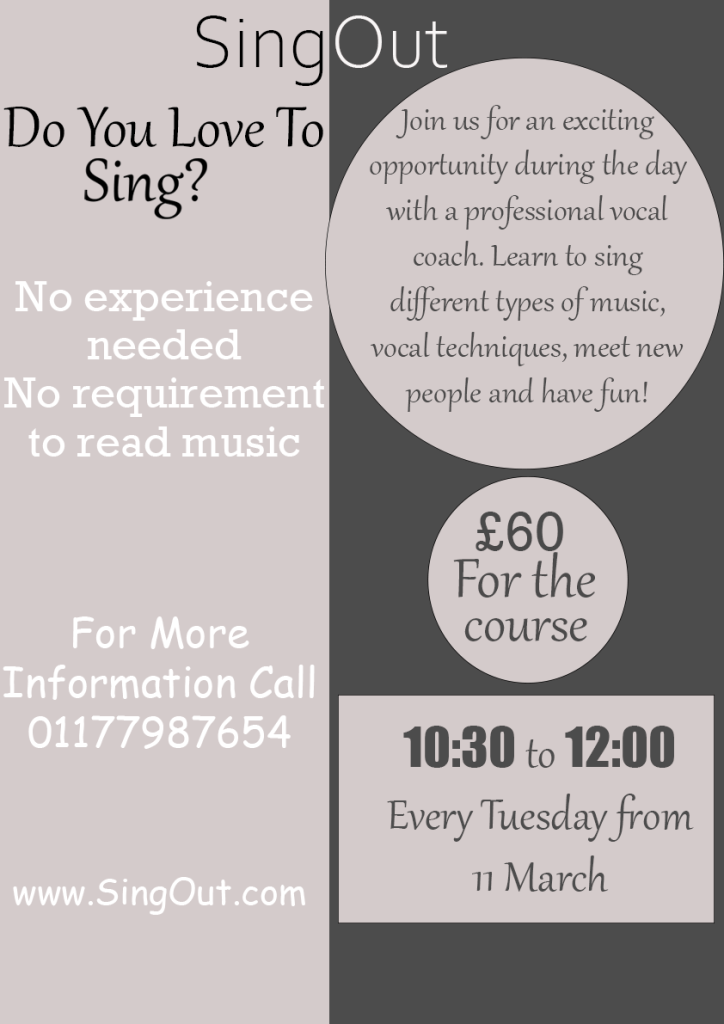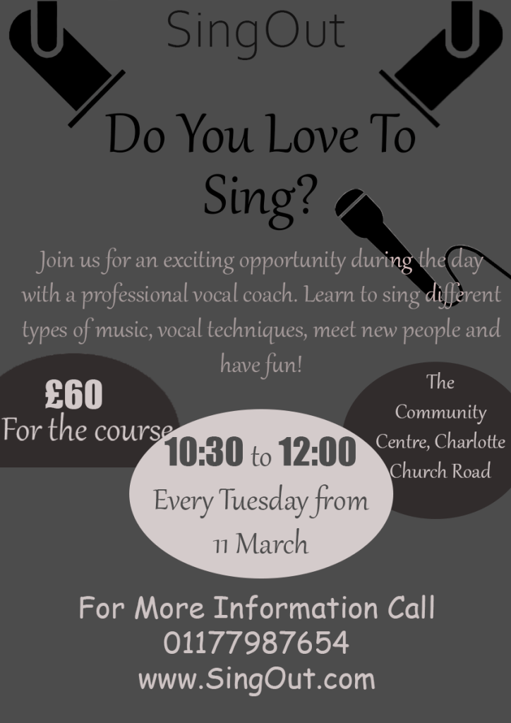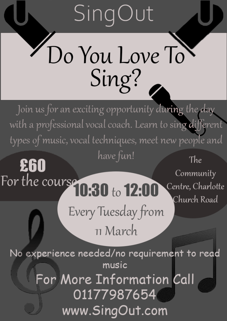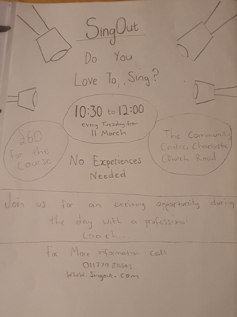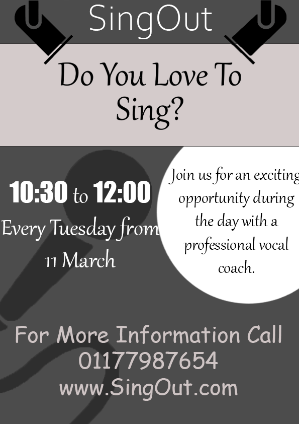 You have been asked to design an A3 poster and an accompanying double sided A6 flyer to promote a singing course run by an organisation called SingOut (all one word). They have very little money so want to print these posters on their black and white photocopier. You can use a colour paper if you want.